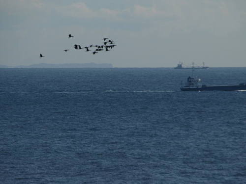 大きな船が行き交い、鳥の群が飛ぶ