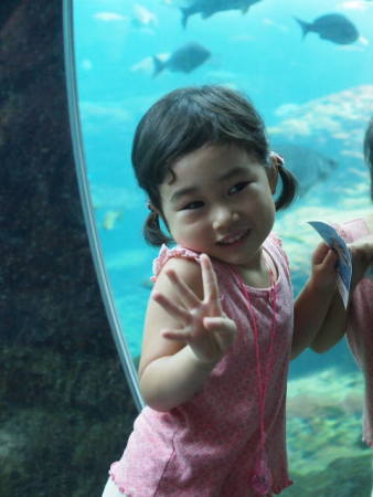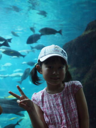 相模湾大水槽の前で、ハイ・ポーズ