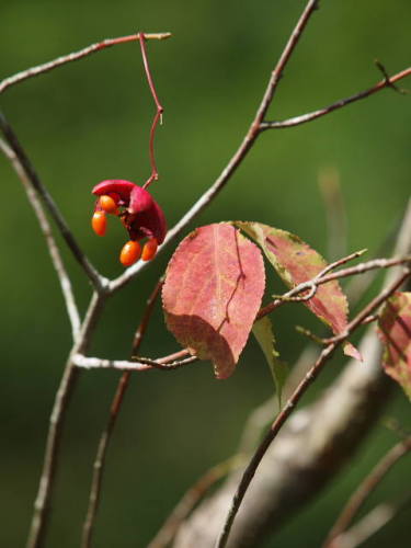 まん丸な実が五つに割れて中の種子がぶら下がって